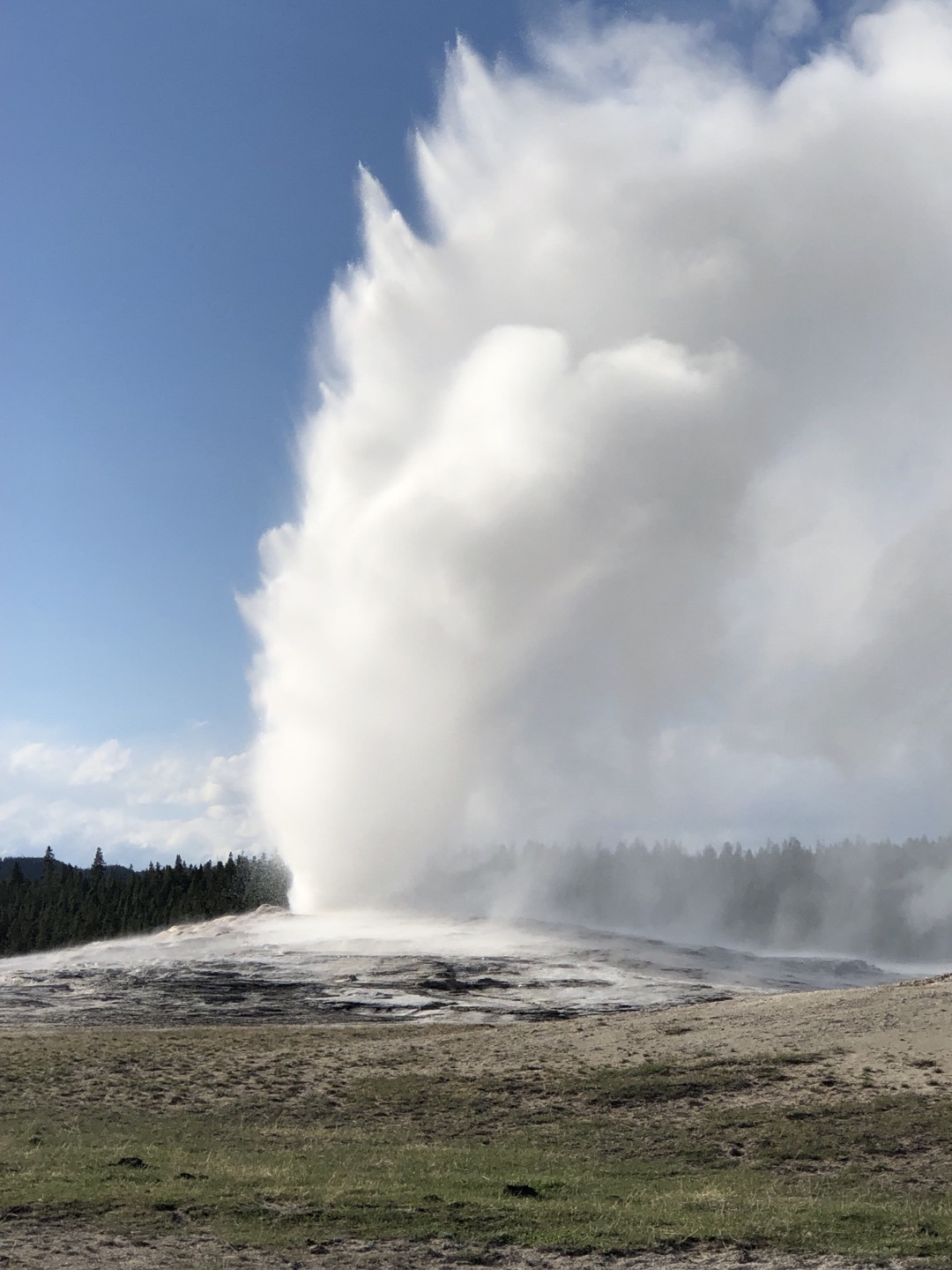 옐로스톤에서 가장 유명한 간헐천 올드 페이스풀에 도착해 제너널 스토어에 들어갔다. 식당 한쪽 벽에 간헐천이 분출하는 시각이 쓰여있다. 약 90분마다 솟아오르는데 다음 시각이 6시 10분. 우리가 도착한 시간은 5시 30분경. 이렇게 완벽할 수가 있나. 화장실을 이용하고 천천히 걸어 간헐천을 볼 수 있는 전망대를 찾았다. 물론 단 번에 바로 찾아가지는 못했다. 동생은 오래전에 한 번 와본 기억에 의존해 방향을 잡았고 구글 맵은 아무리 봐도 잘못된 방향을 가리키는 것 같았다. 나중에 깨달았지만 그 녀석은 올드페이스 풀의 입구 주소지를 가리키고 있었던 것. 결국 지나가는 사람들에게 물어보니 기억과 첨단 기술이 모두 정 반대 방향으로 우리를 인도하고 있었다는 것을 알게 되었다. 다시 뒤돌아서 전망대를 찾아가니 이미 많은 사람들이 모여서 간헐천이 품어져 나오기를 기다리고 있었다. 여러 번의 시동(?) 끝에 드디어 힘차게 물을 뿜어내기 시작하자 여기저기에서 셀폰을 눌러댄다. 얼핏 보아도 전문가용처럼 보이는 사진기들을 세워놓고 촬영을 하는 사람들도 많다.