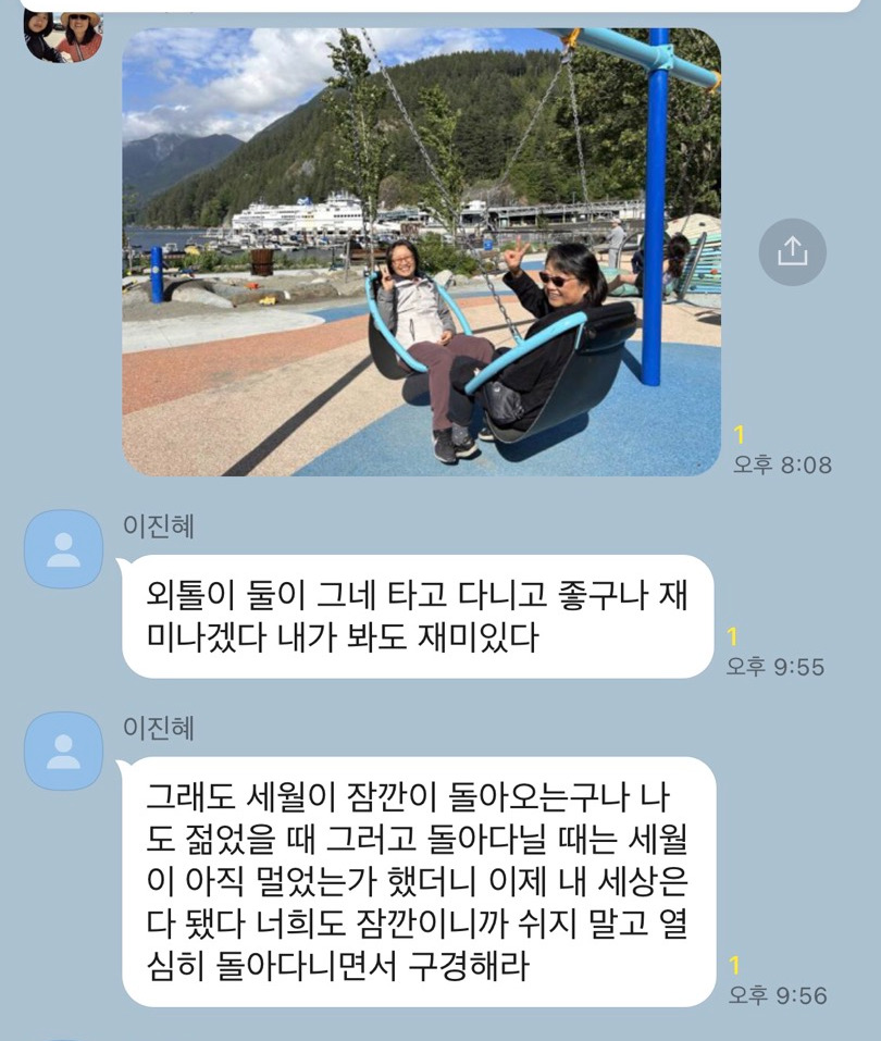 어머니가 사진으로 나마 우리와 함께 하기를 바라며 여행지에서 찍은 사진을 가족 단톡방에 올렸었다. 그 사진들을 보며 이러저러한 코멘트를 하시던 어머니의 말씀이 한편으론 즐겁고 한편으로 안타까웠다. 어머니가 이 여행을 함께 할 수 있었더라면… 가능하지 않은 희망사항이지만 그래도 어머니가 이만큼 건강을 유지하고 계시니 우리가 맘 놓고 즐거운 여행을 할 수 있었다는 현실에 만족해야지. 더 욕심부리다 탈 나는 수가 있지.