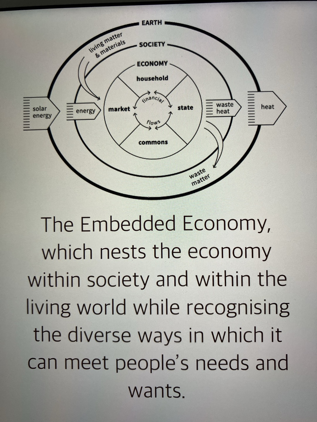 두 번째 그림은 21세기 경제학적 이해에 맞는 경제 시스템을 표현하고 있다. 경제는 사회 안에 내재해 있으며 사회는 살아있는 자연 속에 존재한다. 동시에 사람들의 필요와 욕구를 충족시킬 수 있는 다양한 방법이 존재한다는 것을 함께 인식하게 해 준다.