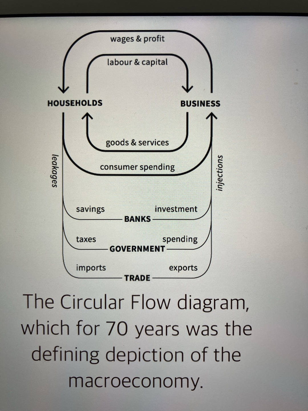 위 첫 번째 그림은 전통적인 경제학이 경제 시스템을 이해하는 방식을 표현한 것이다. 가정과 기업이라는 두 주요 경제 주체가 있고 은행과 정부, 무역 시스템에서 각각 투입과 유출이 단선적으로 연결된다.