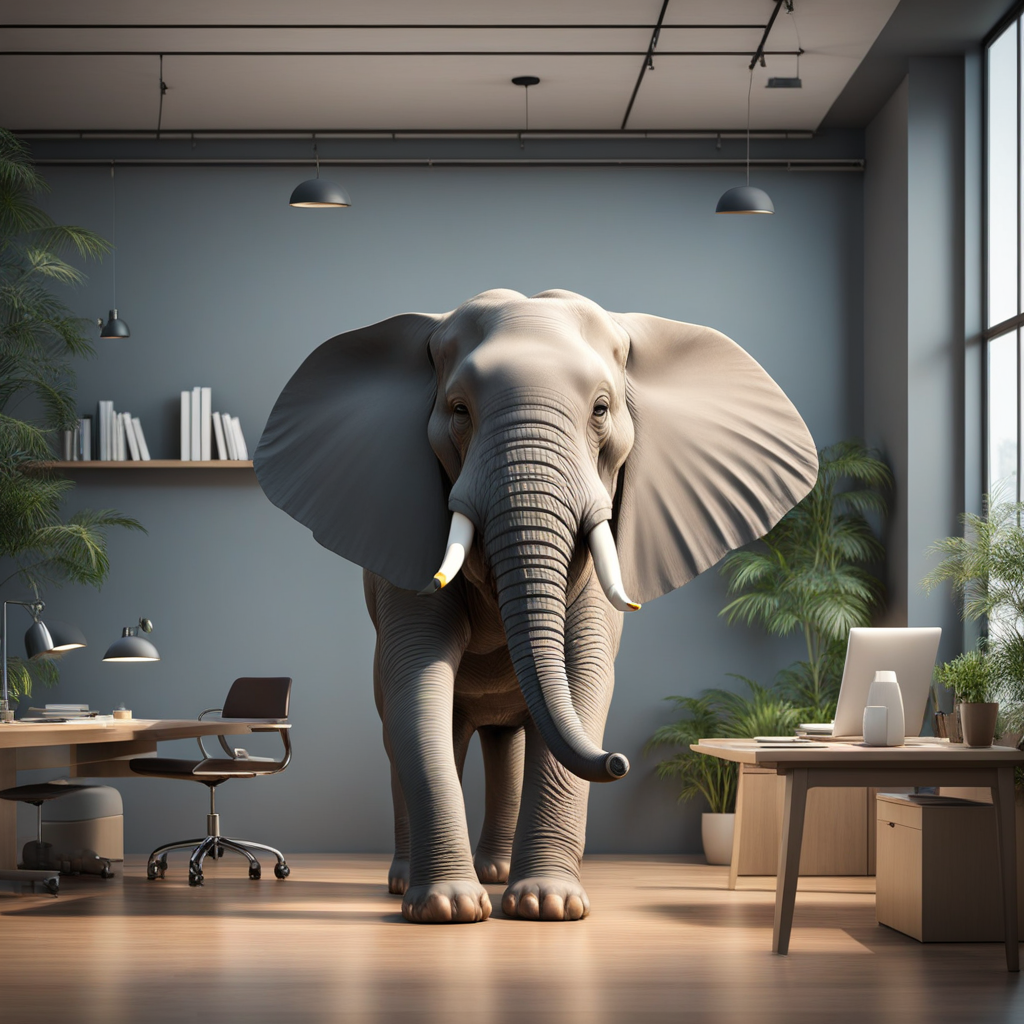 어느 날부터 방 안의 코끼리가 들어왔다. 뭔가 잘못되었고, 문제들이 뻔하게 눈앞에 보였지만 그 누구도 문제제기를 하지 않고 코끼리를 커다랗게 키워나갔다. 어느 순간부터 대화는 단절되었고, 서로의 감정을 모르는 척 하기 시작했다. 방 안의 코끼리는 지금 어마무시한 크기로 사무실을 차지했다. 어느 누구도 코끼리의 'ㅋ'자도 꺼내지 않는다.