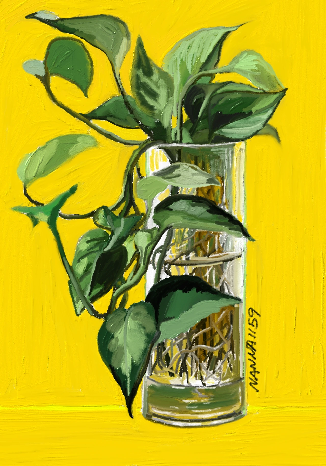 스킨답서스 한 줄기를 화병에 꽂아둔 지 5년. 해마다 잘린 줄기 사이사이 가느다란 생명줄을 늘어뜨리더니 복제에 복제를 거듭하며 화병 3개를 만들어주었다. 어떤 것이 시작이었는지는 잊어버렸다. 그는 반복을 거듭하며 잎을 내고 내일을 향해 줄기를 키우며 나와 일상을 공유하고 있다. 하루에 한두 번 환기를 위해 창을 열면 새로운 바람에 부르르 몸을 떨며 살아있음을 노래하는 식물. 같은 줄기라도 서로가 원하는 빛이 다르니 방향도 다 제작각이다.