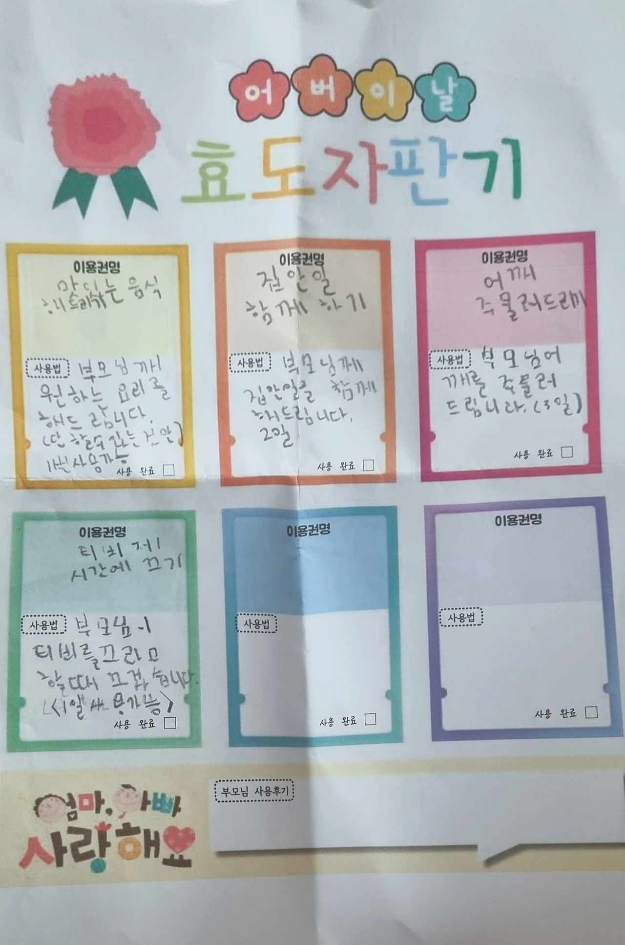 5월 8일은 훌쩍 지났지만 아직 우리 집엔 10살 아들의 효도쿠폰 미션이 남아있습니다. 학교에서 카네이션 카드와 함께 만들어온 쿠폰은 '맛있는 음식 해드리기', '집안일 함께 하기', '어깨 주물러드리기', '티브이 제시간에 끄기'가 있었습니다. 조금은 느리게 흘러가도 좋은 일요일. 아들의 첫 번째 효도미션으로 토스트와 라면이 브런치 메뉴로 선정되었습니다. 혼자서 계란을 깨고 적당한 그릇에 풀더니 조막 막 한 손을 이용해 맛있게 토스트를 만들어 냈습니다. 원래도 집안일이며 자신의 할 일을 미루지 않는 성격이더니 처음 해보는 토스트도 적당한 굽기로 잘 해냈습니다. 식당에 가면 수저 젓가락을 놓고 물을 떠서 준비하고 음식을 다 먹으면 자리도 깨끗이 정리하는 열 살 우리 아들.