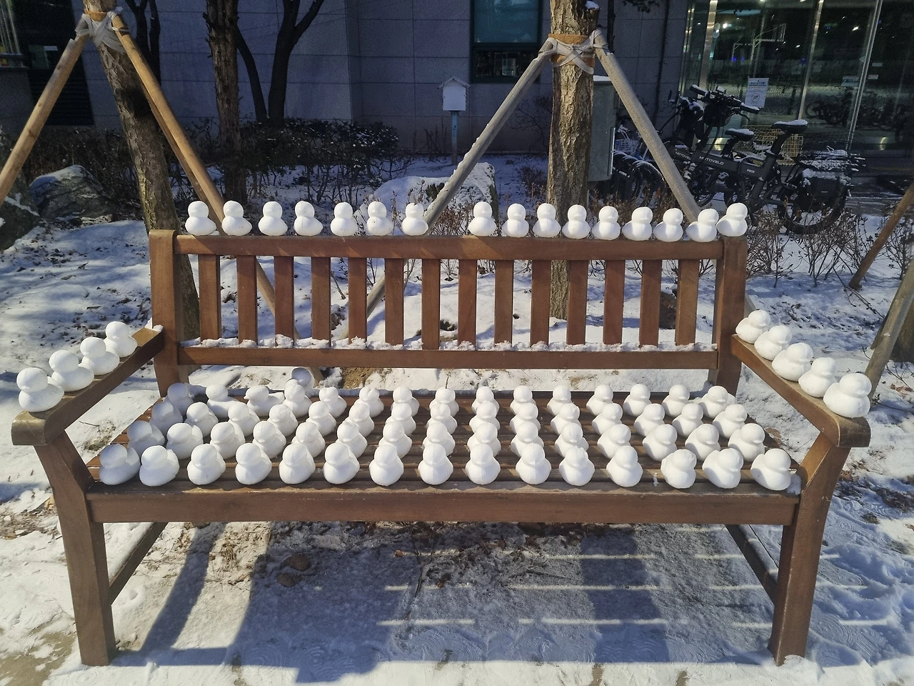 새벽운동을 시작한 지 3달쯤 되니 남산만 했던 배가 조그마한 언덕으로 변하고 있다. 다리에 힘이 생기니 많은 활동에서 쉬 피로해지지 않는다. 아르바이트를 끝나고 식구들 저녁을 챙기고 설거지를 하고 나면 온몸의 기운이 다 빠져나간 듯 힘들었었는데 요즘은 그런 일이 많이 줄었다. 그렇게 매일 하는 운동의 효과를 체험하기 위해 아침 일찍 공원에 갔을 때 밤새 요정들이 왔다가 갔는지 새하얗고 앙증맞은 눈오리들이 군대처럼 사열해 있었다. 베란다에는 봄이 와있고 공원에는 이 겨울을 지키고야 말겠다는 의지로 열 지어 서 있는 눈오리를 보게 된 하루였다.