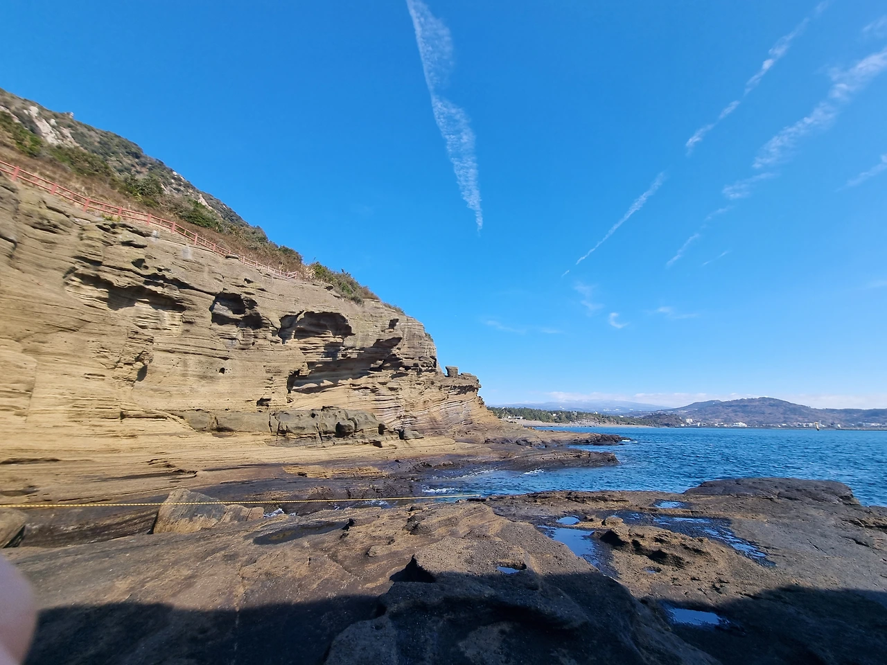 눈보라와 함께 길가의 표지판을 넘어뜨릴 정도의 바람이 불던 제주는 오늘 아침, 눈부신 파란 하늘과 따스한 볕을 선물해 주었습니다. 투명하게 빛나는 바다를 따라 층층이 시간의 역사가 새겨진 용머리 해안의 풍광은 이국적이면서 섬세하게 빛나는 명품이었습니다. 구불구불 이어진 길 모퉁이를 돌아설 때마다 저절로 탄성이 나왔고 우리나라 자연에 대한 자긍심 또한 하늘 높은 줄 모르게 치솟는 하루였습니다. 새벽에 10km를 혼자 걷다 보니 오후엔 급격하게 체력이 떨어져 힘들었지만 눈이 시릴 정도로 파란 하늘을 본 것만으로도 오늘치 행복이 가득 충전되는 하루였습니다.