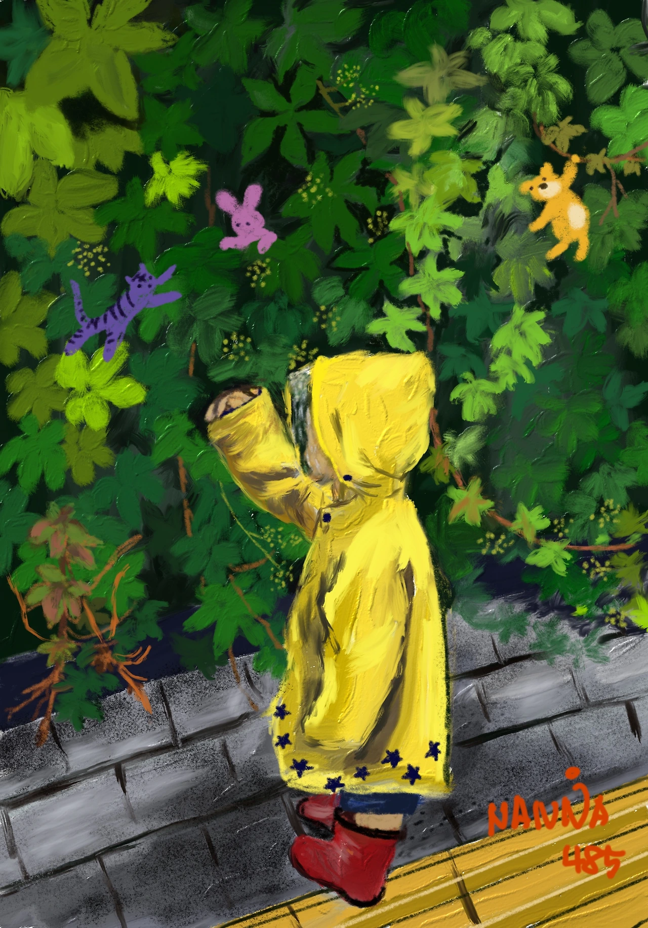 비가 오는 날, 아이와 함께 신호대기를 하다가 푸른 담쟁이덩굴 앞에선 아이의 모습에서도 어떤 기대가 보입니다. 덩굴이 신기한지 살짝 손을 가져가는 모습이 여간 귀엽지 않습니다. 담쟁이덩굴처럼 벽에 기대어 사는 삶이라도 그것을 꿋꿋이 붙잡고 오른다면 그 또한 의미 있는 일일 것 같습니다. 우리 모두 오늘을 꼭 붙들고 힘차게 올라가 봐요.