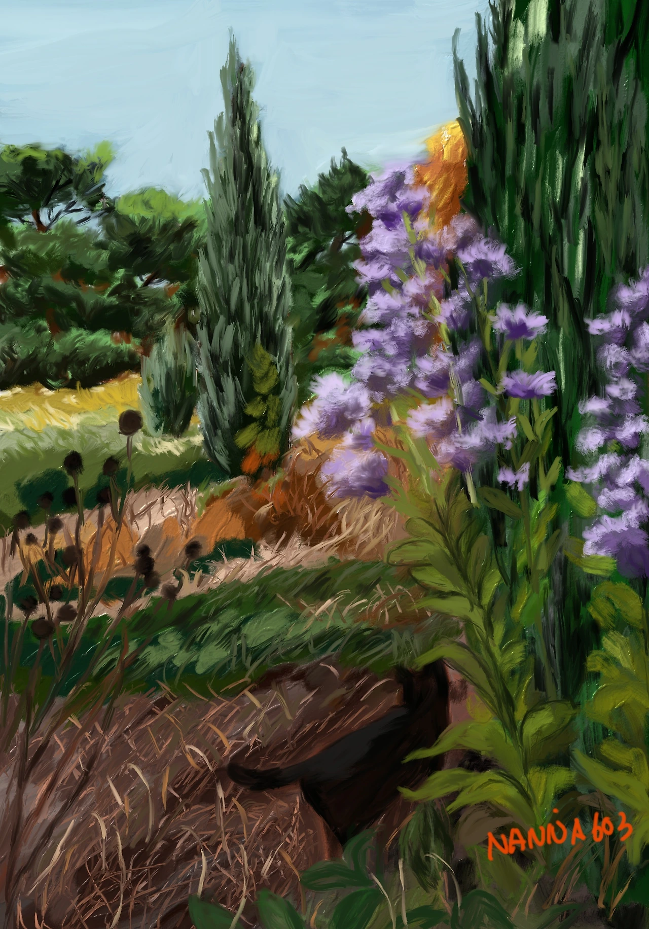 일상에서의 나는 늘 그림 소재를 찾아다니는 방랑자가 된다. 익숙한 풍경, 매 번 보아오던 나무들, 철마다 피는 꽃들도 새롭게 보고, 다시 보려고 노력한다. 어제 아이들과 어린이 대공원에 갔다가 작은 정원이 눈에 들어왔다. 떠돌이 고양이 두 마리도 그곳이 좋았는지 내가 곁에 가도 달아나지 않고 한가롭게 가을을 산책을 한다. 볕은 따뜻하고 그늘은 추운 가을 오후.