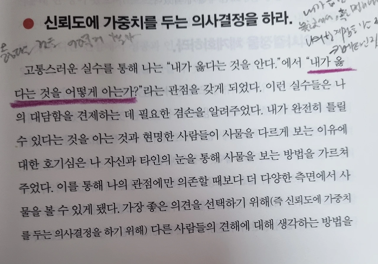 수많은 의사결정에서 나는 내 중심, 내 견해, 내 경험치에 바탕을 두고 결정을 내립니다. 그렇기에 수많은 결과치를 검증하고 다른 관점을 투영하기에는 우리 시야가 너무 좁습니다. 나 스스로 내 결정이 백 프로 완벽하지 않다고 생각하고 있지만 그에 상응하는 해결책을 갖고 있지 않을 때도 많고 반대되는 의견이 옳더라도 내 존재가 부정당했다는 패배감을 견딜 수 없는 경우에는 옳고 그름이 아닌 나 자신을 지키는 방어벽으로 '내가 옳았음'을 고집하게 됩니다. 하지만 그런 방법으로는 나 자신은 물론이고 관계하는 모든 인연들에 대해서도 우리 자신을 지킬 수는 없습니다.