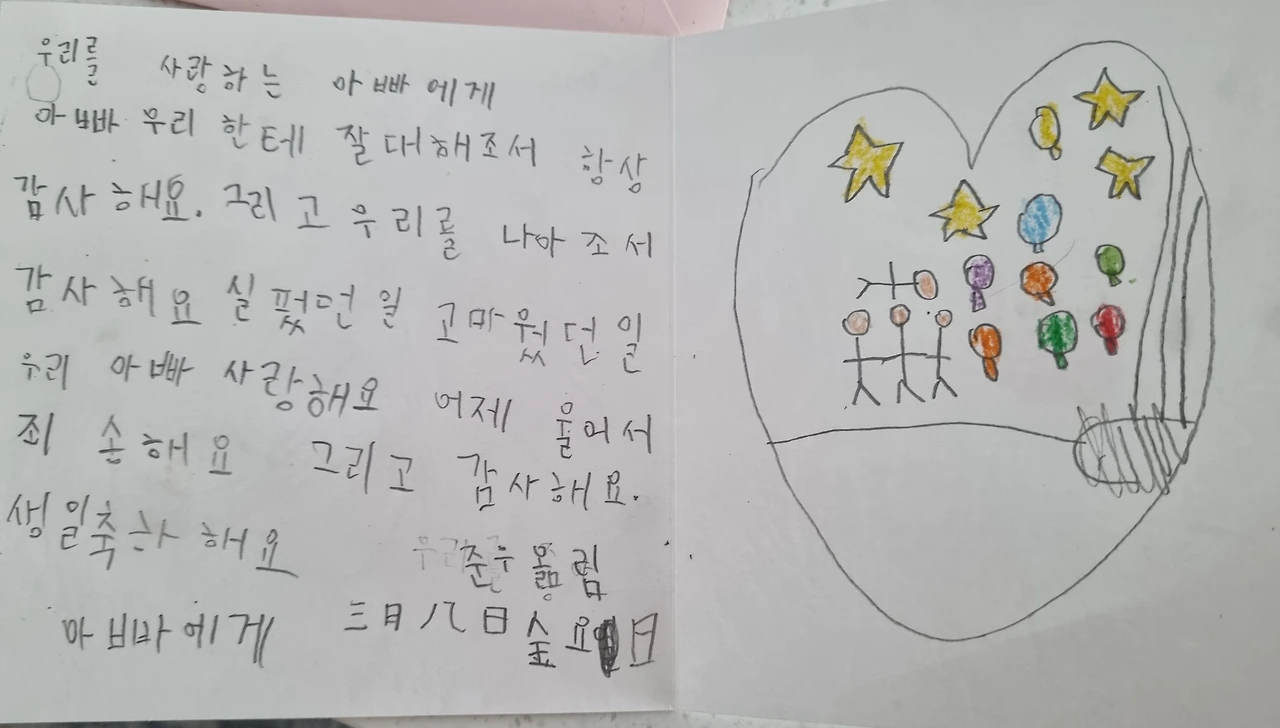 이제 제법 자란 첫째는 생일카드를 썼는데 여기저기 맞춤법이 틀린 게 오히려 기념도 되고 앙증맞아서 예뻐 보입니다. 사랑이란 흔한 말이 우리에게는 영양제가 된다. 마음으로 주고받는 말들이 살이 되고 뼈가 되어 나를 존재감 있게 살게 한다. 흔하디 흔한 사랑이란 말이 자양강장제가 되고 각성제가 되기도 하며 때론 만병통치약이 되기도 한다. 그러니 오늘, 눈이 마주친 이 시간, 서로의 눈을 보며 '사랑한다, 어제도 오늘도 무지무지 사랑한다'라고 말해주세요.