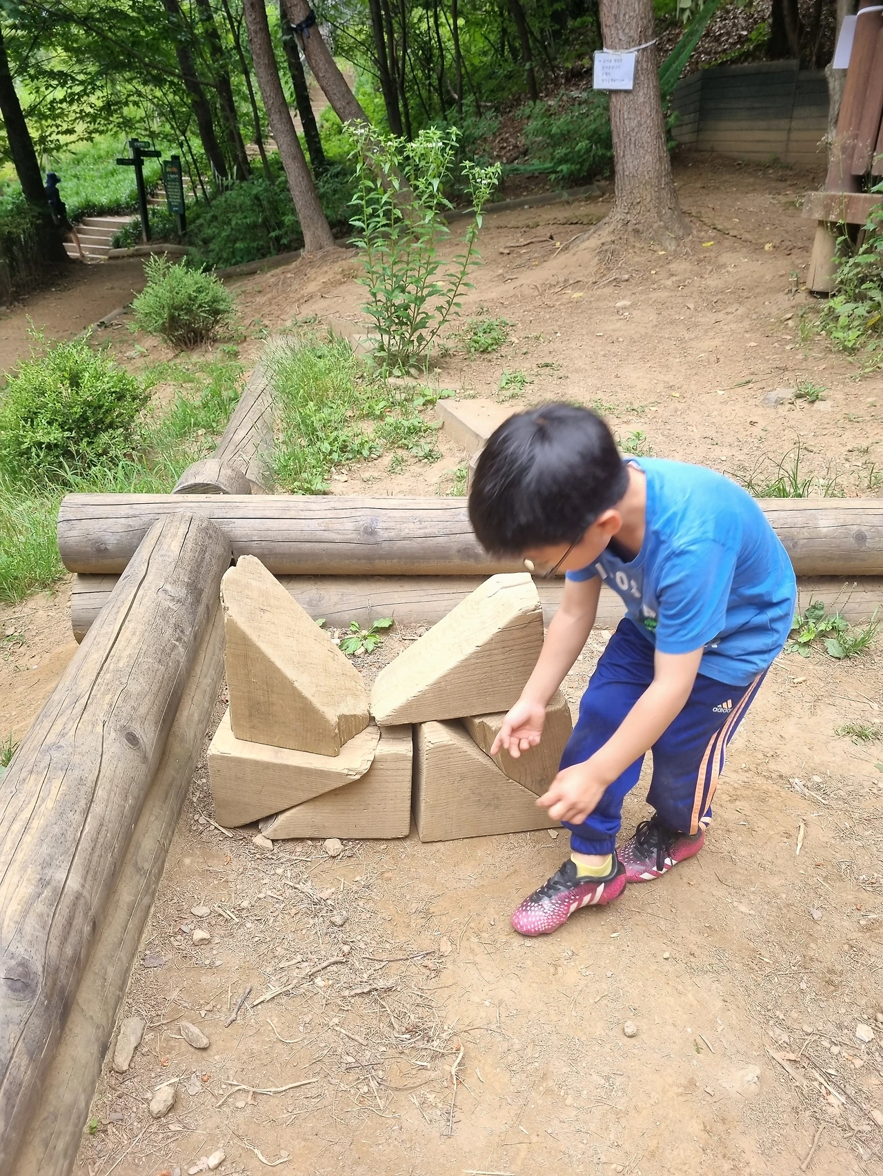 유아숲에서 나무블록을 맞추는 둘째
