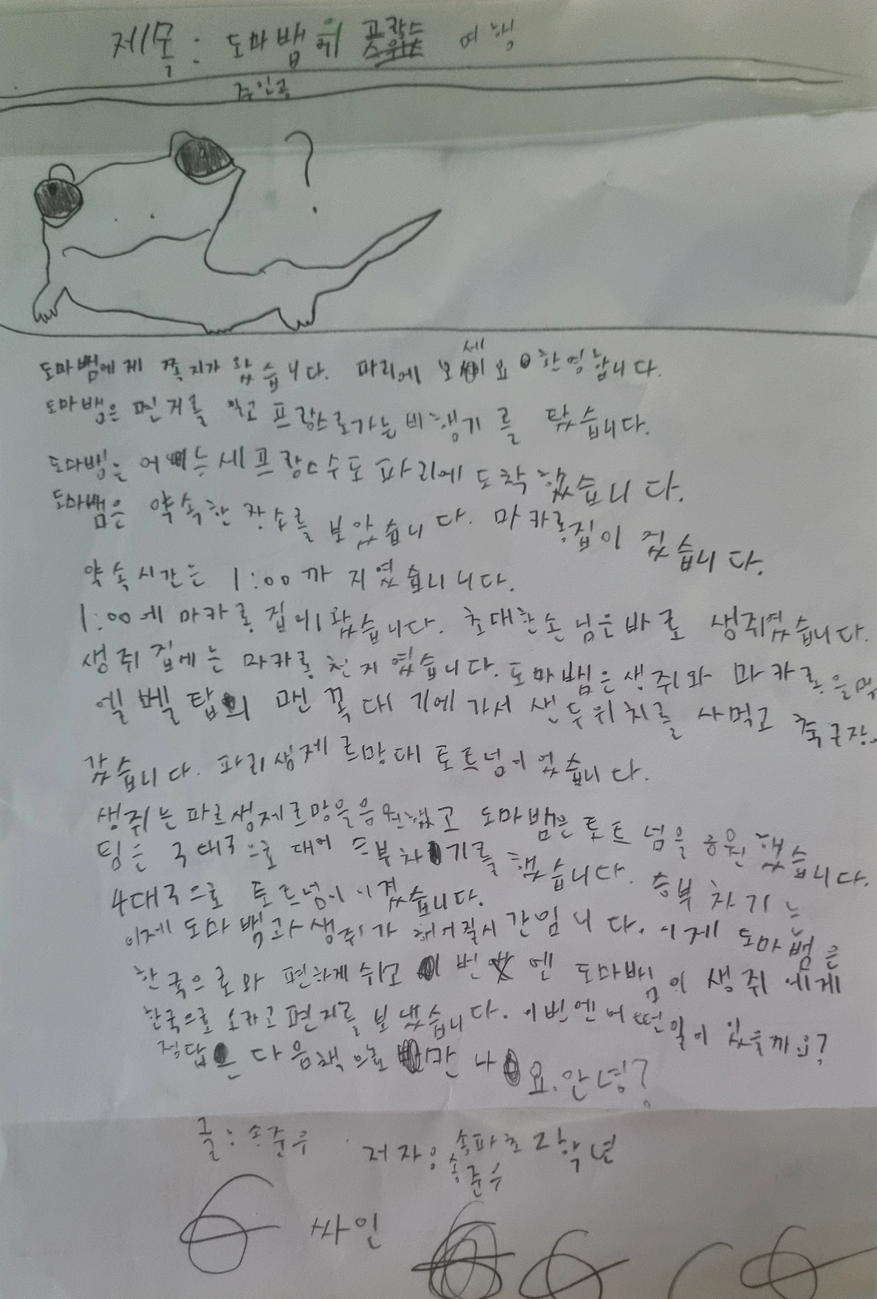 요즘 두 똥그리들의 그림책 만들기 작업을 준비하고 있습니다. 며칠 전부터 두 아이들에게 작가로서 쓰고 싶은 책을 생각해 보라고 했건만 놀이터에서만 열심일 뿐 당최 시간을 내주지 않았지요. 하지만 어제저녁을 먹은 후 '그림책에 대해 생각해 보자' 하며 책상에 앉혔습니다. 그랬더니 어떻게 해야 하는 거냐고 묻더라고요. 먼저 주인공이 있어야 하고 이야기를 만들어야 한다고 했더니 알겠다면서 앉은자리에서 쓱쓱 뭔가를 적더군요. '이놈이 또 장난하는구나..' 하며 혼내려고 들여다봤더니 지우개도 쓰지 않고 하나의 스토리를 적어냈습니다. 모험을 하거나 특별한 에피소드는 없었지만 한 번에 A4용지 가득 이야기를 쓸 수 있다는 것에 놀라고 감사한 마음이 들었습니다.