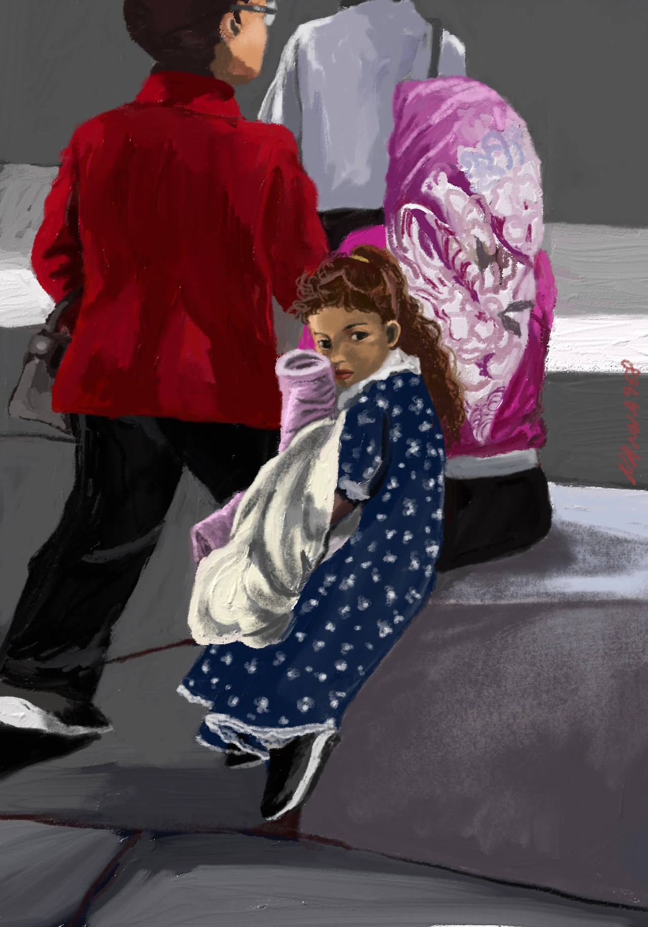 아이는 신호등 앞 작은 표지석 같은 바위에 엄마와 다른 방향으로 돌아앉아 뭔가 불안한 듯 불만스럽고 위태롭게 전방을 주시하며 경계태세를 늦추지 않고 있었다. 구경이라기보다는 보호막을 치고, 신경을 곤두선 모습이 조금 위태롭고 안쓰럽게 느껴졌다. 자신이 떠나온 곳과 맞지 않는 계절이었는지 짧은 소매옷이 더 추워 보였다. 떠나왔다는 것, 언제든 이쪽에서 저쪽으로, 내가 알던 세계에서 너무나 낯선 곳으로 움직일 수 있고 한순간 바뀔 수 있는 것이 인생이란 걸 아이는 알아버렸을까. 오늘 아침은 여름이었는데 한숨 자고 났더니 바람이 차갑게 식은 가을 거리 한 복판이란 걸, 그렇게도 인생은 변할 수 있다는 걸 알게 되었을까.
