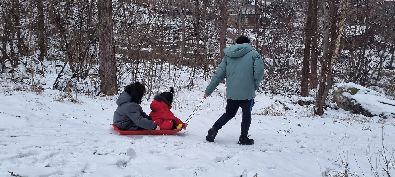 해가 지기 전에 눈썰매를 타기 위해 서둘렀지만 한걸음 걸을 때마다 사박사박 울리는 겨울산의 숨소리에 묵은 때가 씻겨가는 기분도 들었습니다. 이렇게 겨울 한 귀퉁이에 또 하나의 우리의 추억을 새겨봅니다.