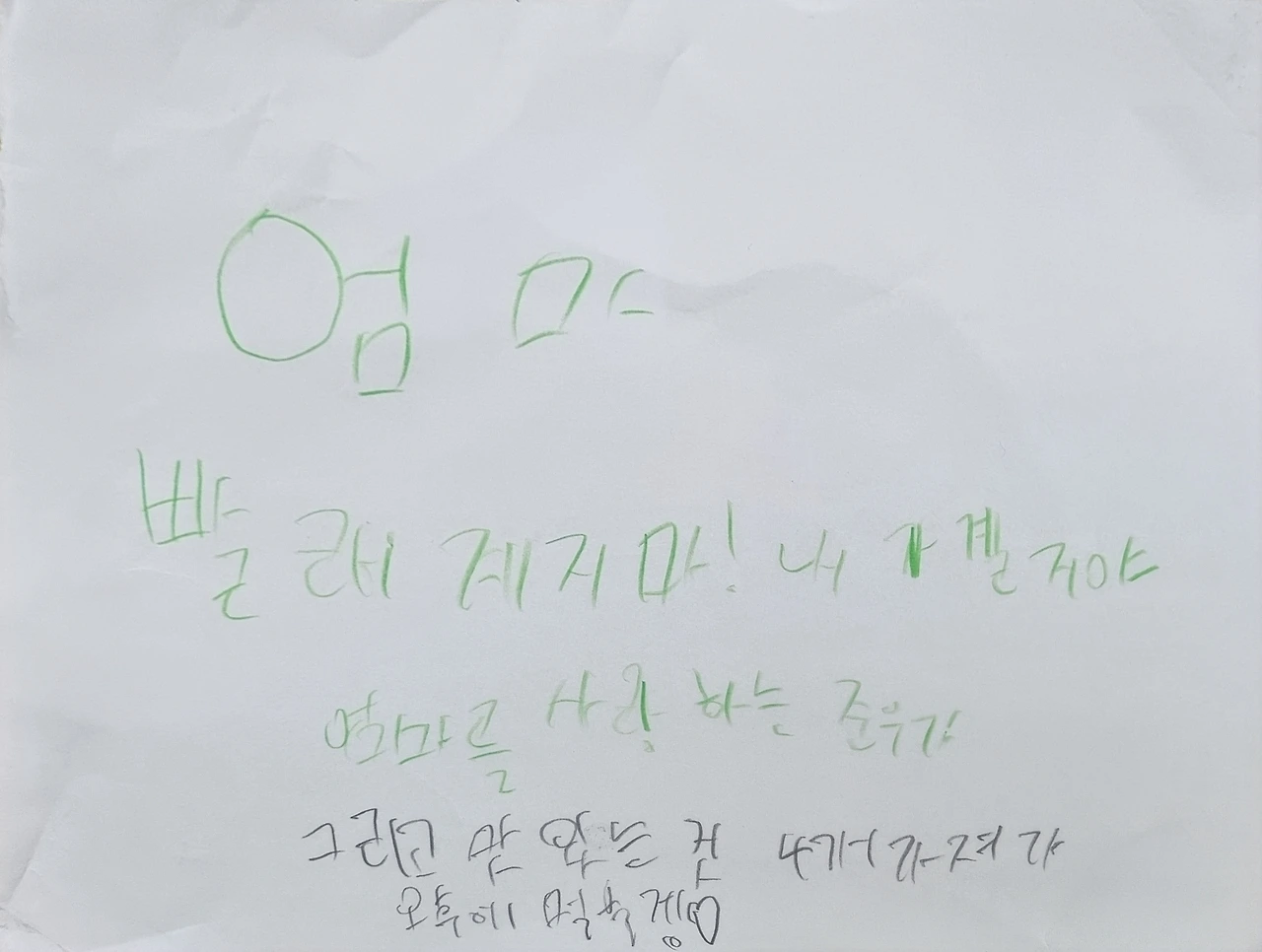 요 며칠 오전 아르바이트 때문에 아이들 등교를 일찍 준비하는 날들이 많아졌다. 평소에 철저한 준비를 하는 성향이 짙은 첫째는 엄마의 시간에 맞춰 일찍 일어나 아침 공부를 하고 책을 읽고 등교를 준비하는데 초기 감기 증세를 보이던 오늘은 늦잠을 잤다. 출근을 미룰 수는 없어서 아이들 가방만 후문에 두고 아이들보다 먼저 집을 나섰다. 특히나 오늘은 첫째와 둘째 방과 후 시간마저 달라서 둘째가 걱정이었다. 그래서 어젯밤에 첫째에게 수업이 끝나면 늘봄교실에 있는 둘째까지 챙겨서 피아노를 치고 오라고 당부해 두었다. 19개월 차이나는 형아는 동생을 잘 챙기는 편이어서 걱정이 덜했다. 워낙 세심해서 당연히 잘 하리란 믿음이 있으니 오전 아르바이트를 끝나고 수영장에서 운동을 하고 가락시장에서 아이들 좋아하는 생선을 사서 집으로 왔다. 오래간만에 양손 무겁게 짐을 들고 왔는데 현관문에 첫째의 메모가 대문짝만 하게 붙어있었다.