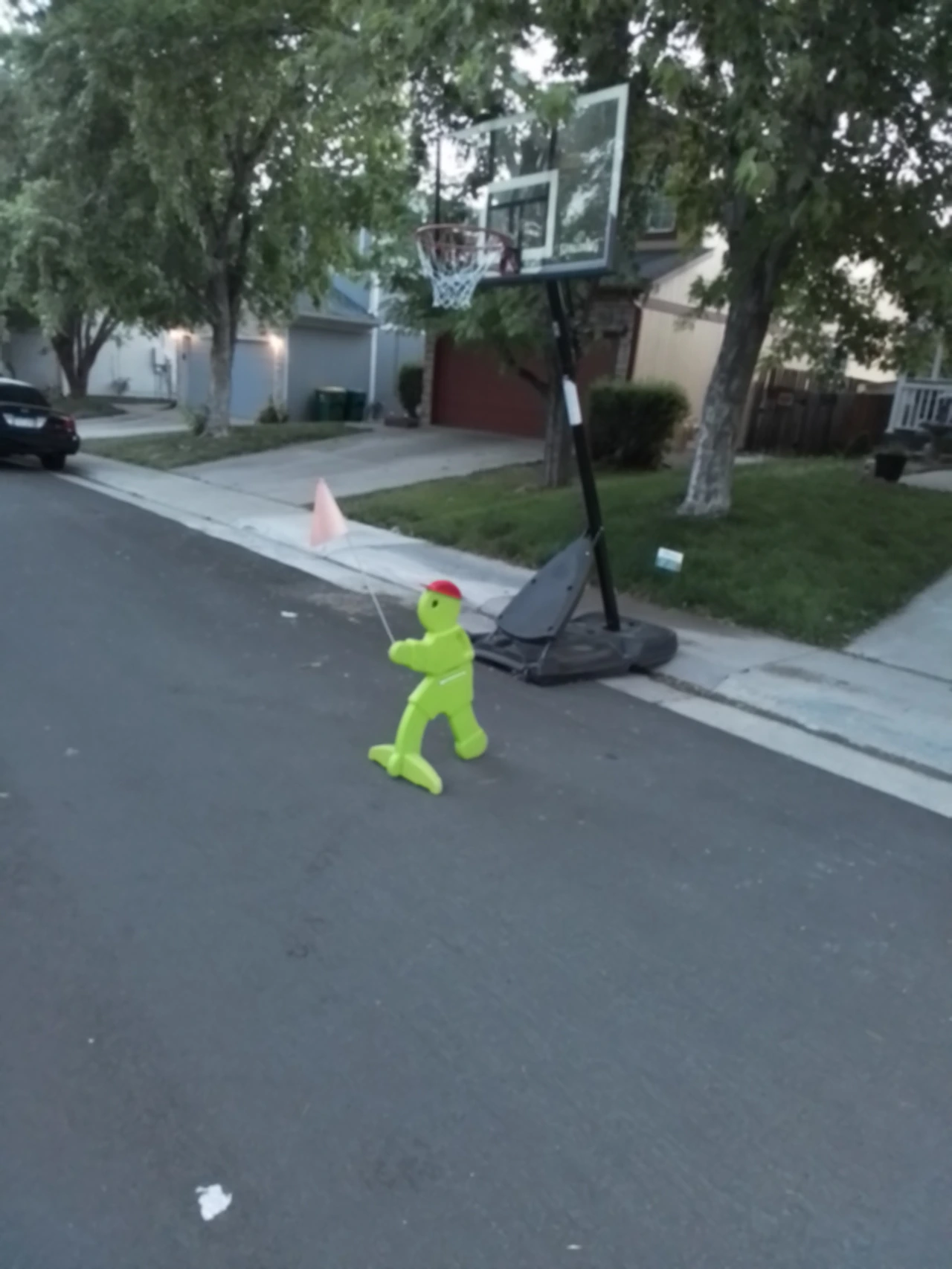 녹색 아이 하나가 도로 한복판에 서 있다. 형광 연두색의 몸통, 빨간 모자, 작고 둥근 손에 들린 깃발. 움직이지 않지만, 그는 분명 무언가를 말하고 있었다.