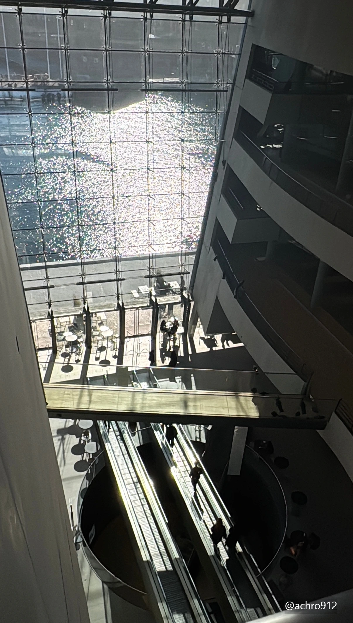 거대한 아트리움 창밖의 운하를 바라보고 있으면