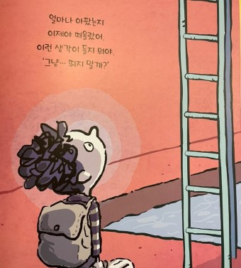 물에서 개운한 모습으로 올라오는 주인공의 표정이 뿌듯함과 자신감으로 가득하다. 지금껏 걱정과 의심과 두려움으로 깊이 빠져 있던 좌절감에서 벗어난 얼굴이다. 자존감이 회복되었다. 책의 첫 장면에서의 얼굴과는 대조적이다.