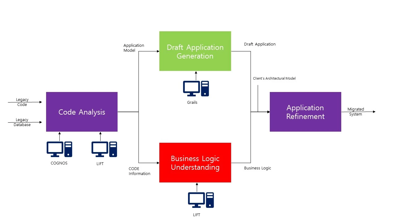 그림과 같이, 먼저 COGNOS와 LIFT의 지원을 받아 데이터베이스와 레거시 코드를 분석하고 모델 클래스를 자동으로 생성한 다음 Grails 프레임워크를 사용하여 초안 애플리케이션을 생성했다. 이러한 프레임워크는 모델 클래스를 받아들이고 자동으로 웹 기반 MVC 애플리케이션을 생성한다. 자동화된 단계로 CRUD 작업(Create, Retrieve, Update 및 Delete)을 포함하는 쓰리티어 응용 프로그램 (데이터베이스에서 웹 페이지로)이 생성되어 많은 작업이 필요없었다. 그다음 비즈니스 로직을 인식하기 시작했고, 다시 한번 LIFT의 지원을 받아 클러스터 감지, 화면 시각화 및 소스 코드 분석으로 reverse engineer 들은 비즈니스 로직 정보를 식별하고 문서화한 다음 이를 순방향 엔지니어링 팀으로 전달한다. 분석 팀은 새로 생성된 애플리케이션을 수정하여 비즈니스 로직을 삽입하고 클라이언트의 아키텍처 모델과 일치하도록 조정했다.