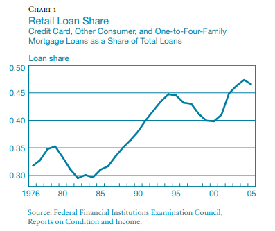Timothy 외 3인은 1976년부터 2005년까지의 리테일 대출이 30%에서 47%까지 통계적으로 의미 있게 증가한 것을 보여주며, 모기지 관련 대출의 성장이 이를 주도했다고 봤다. 또한 이런 측면은 저축은행 활동 감소 대신 미국 대형 시중은행들이 리테일 뱅킹사업에 들어가게 되면서 이런 현상이 일어났고, IT기술 발전도 한 가지 이유로 설명하며 신용카드와 모기지 사업 활동에 규모의 경제가 있다고 설명한다. 이후 2000년대에 들어와서는 HE Loan 상품이 추가되면서 리테일 사업이 안정적으로 성장했다고 설명한다.