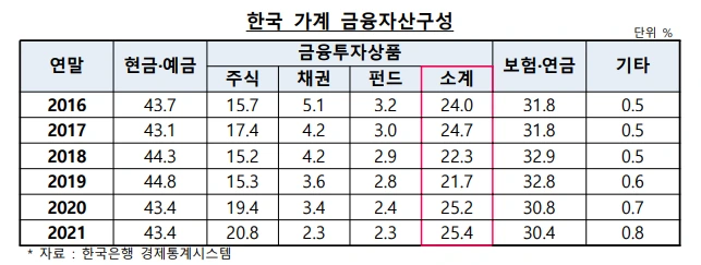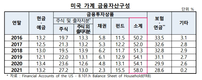 미국과 한국 가계 금융자산구성을 비교하면 미국의 경우는 확실시 대기성 자금보다는 목적성 자금이 크다. 2021년 미국과 비교 시 한국은 개인 예금이 43.4%에 달하고 미국은 13.2%로 미국은 개인금융자산이 투자상품 비중이 높으나 한국은 25.4%로 낮다.