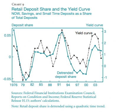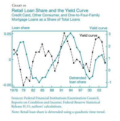 개인여신과 예금 수익률에 대한 양 (Positive) 관계에 대한 설명은, 수익률 곡선이 가파를 때 "캐리 트레이드"로 보인다. 장기 금리가 단기 금리보다 많이 높을 때, 은행은 모기지와 같은 장기 개인 대출에 자금을 조달하기 위해 상대적으로 저렴한 개인 예금을 적극적으로 늘릴 수 있다. 또는 이자율과 수익률 곡선 이동이 Non Retail 은행 및 금융 시장 활동의 수익성에 영향을 미치는 한, 리테일 뱅킹과 수익률 곡선 간의 관계는 위에서 논의한 Retail/Non-Retail 주기로 보인다.