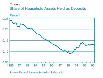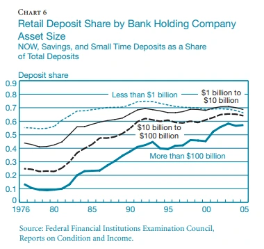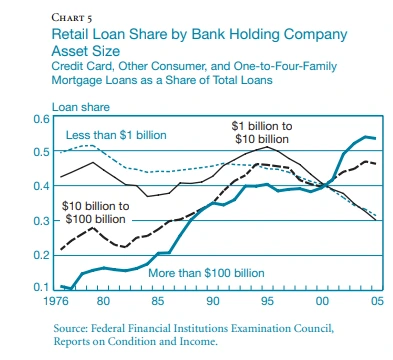 측정기간의 개인 대출 포지션의 증가는 전적으로 자산이 100억 달러를 초과하는 은행, 특히 이 그룹에서 가장 큰 은행에 의해 주도되었다. 자산이 1,000억 달러를 초과하는 은행의 소매 대출 점유율은 1999년 38%에서 2005년 말 거의 55%로 증가했다. 이와 대조적으로, 중소 지주 회사의 소매 대출 점유율은 실제로 같은 기간 동안 감소했습니다. 결과적으로, 큰 은행들은 작은 은행들보다 소매 대출의 더 높은 비율을 가지며 클수록 이익도 커진다라는 확신을 미국은행들이 사이에 갖게 된 거 같다.