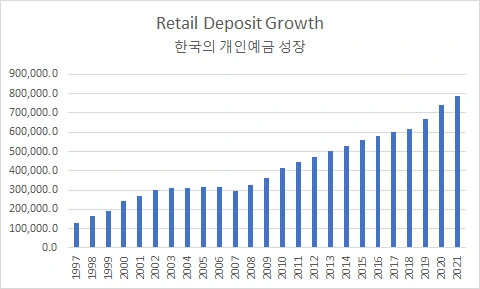 개인예금비중이 낮아지고 있다는 점은 기업이 대기성 자금을 은행에 보관하게 되면서 낮아지는 추이로 여겨진다. 아래 한국 개인예금 성장은 2009년부터 가파르게 성장하여 현재 700조 이상 수준이나 기업예금도 이에 못지않게 많이 늘어난 것으로 추정된다.