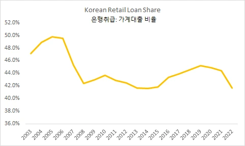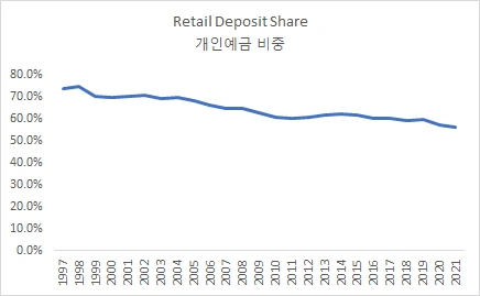 한국의 경우 리테일이 본격화되었다고 해도, 예금은행에서의 비중은 아직 50%에 미치지 못하고 있다.