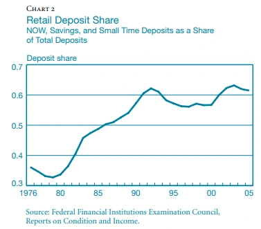 이렇게 리테일의 역할이 중요해졌다는 증거를 보이기 위해서 대형은행들의 소매대출과 예금 비중이 점차 확대가 되고, 미국은 오랜 기간 동안 소매 관련 대출의 증가가 있어왔고, 중요한 건 주로 더 큰 은행들에 의해, 대부분 모기지와 신용카드 사업 라인에 내재된 규모의 경제를 실현할 수 있는 위치에 있는 은행들에 의해. 리테일 예금 점유율은 모든 규모의 은행에서 증가했으며, 1980년대 초와 중반에 예금 금리에 대한 상한선 제거로 인한 산업 전반의 영향을 가장 잘 반영되었다.