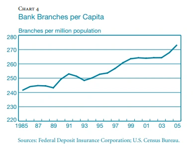 한국은 1990년대 말 외환위기 이후 2000년대에 들어오면서 은행 간 합병 그리고 대형화 이후 가장 큰 화두가 은행의 안정적 운영이었기 때문에 개인고객 업무를 전략적으로 선택한 것도 있었다. 하지만 미국은 90년대부터 리테일 뱅킹사업이 스스로 각 시중은행들의 수익모델에서 중요한 위치를 차지하며 기업 대비 리테일 사업의 대차대조표가 비등해지는 결과를 보여주기도 했다. 그러면서 은행들은 리테일 채널을 통해 수신을 조달받기 위해서 지점수를 급격하게 확장하였다. 90년대처럼 상품수를 늘리거나, 채널의 다양화, 수익의 다양화라는 화두와 다르게 2000년대 들어오면서 리테일 뱅킹 사업은 변화하기 시작했다.