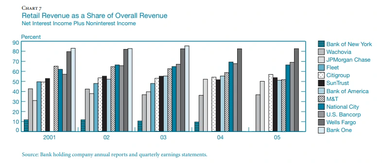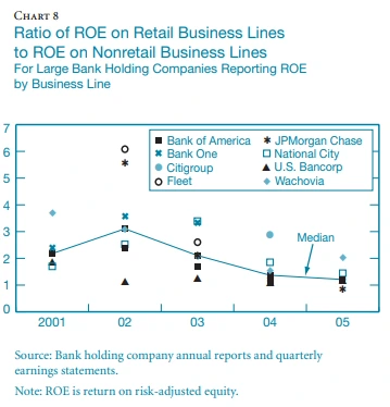 Hirtle과 Stiroh는 리테일 뱅킹이 비교적 안정적인 비즈니스일 수도 있지만 상대적으로 수익률이 낮은 사업이기도 하다고 결론 내렸다