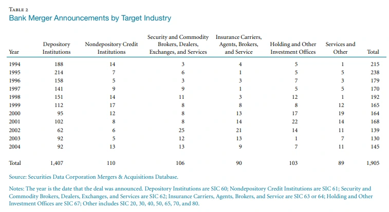 미국 대형 은행의 인수 동향에서 전략적 변화 핵심을 알 수 있다. 은행의 다른 은행 인수는 Riegle-Neal Act of 1994 법이 주(States) 간 은행 및 지점에 대한 인수합병 제한이 없어지고, 1990년대 중반에 M&A는 정점에 달했다. 또한 Gramm Leach-Bliley Act of 1999 법으로 은행 활동 제한이 없어지면서, 비은행이 은행 인수를 통한 진출이 급증하게 되었고, 은행의 비은행 자회사 설립 및 인수도 종종 발생했다. 이렇게 되면서 은행의 리테일 뱅킹에 전략적 투자, 확대, 성장등에는 관심이 감소가 되었다.