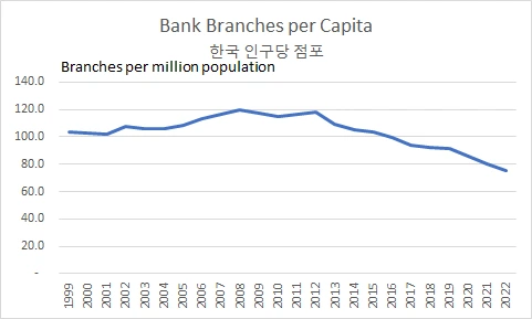 2005년 당시 리테일 뱅킹 사업 붐이 일어났을 때 미국은 인구 백만명당 점포수가 280-300개로 점포수는 급성장을 했었다. 동시대를 비교한 아래 한국 현황은 1999년부터 2007년까지 인구 백만명당 점포수는 100개에서 120으로 증가했으나 스마트폰이 나오겐 이후인 2013년 이후부터는 점포수가 급격히 떨어지고 있고
