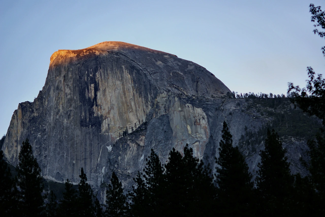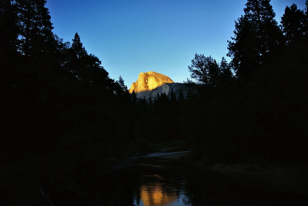저 멀리 보이는 하프돔 (Half Dome)이 일몰에 반사되어