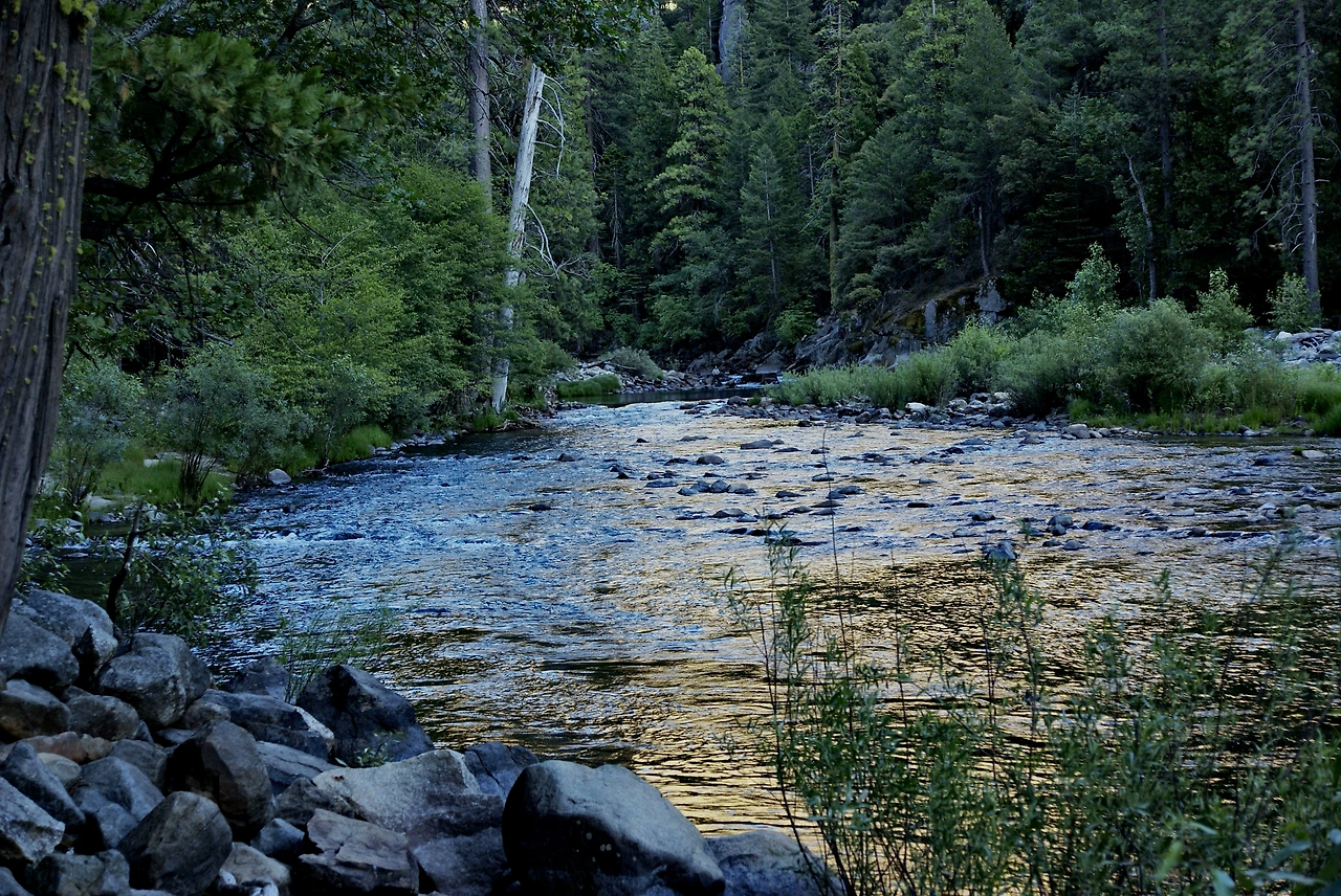 계곡아래로 물이 흐르고, 그물에 비친 요세미티 공원 암석의 빛이 황금색으로 변했다