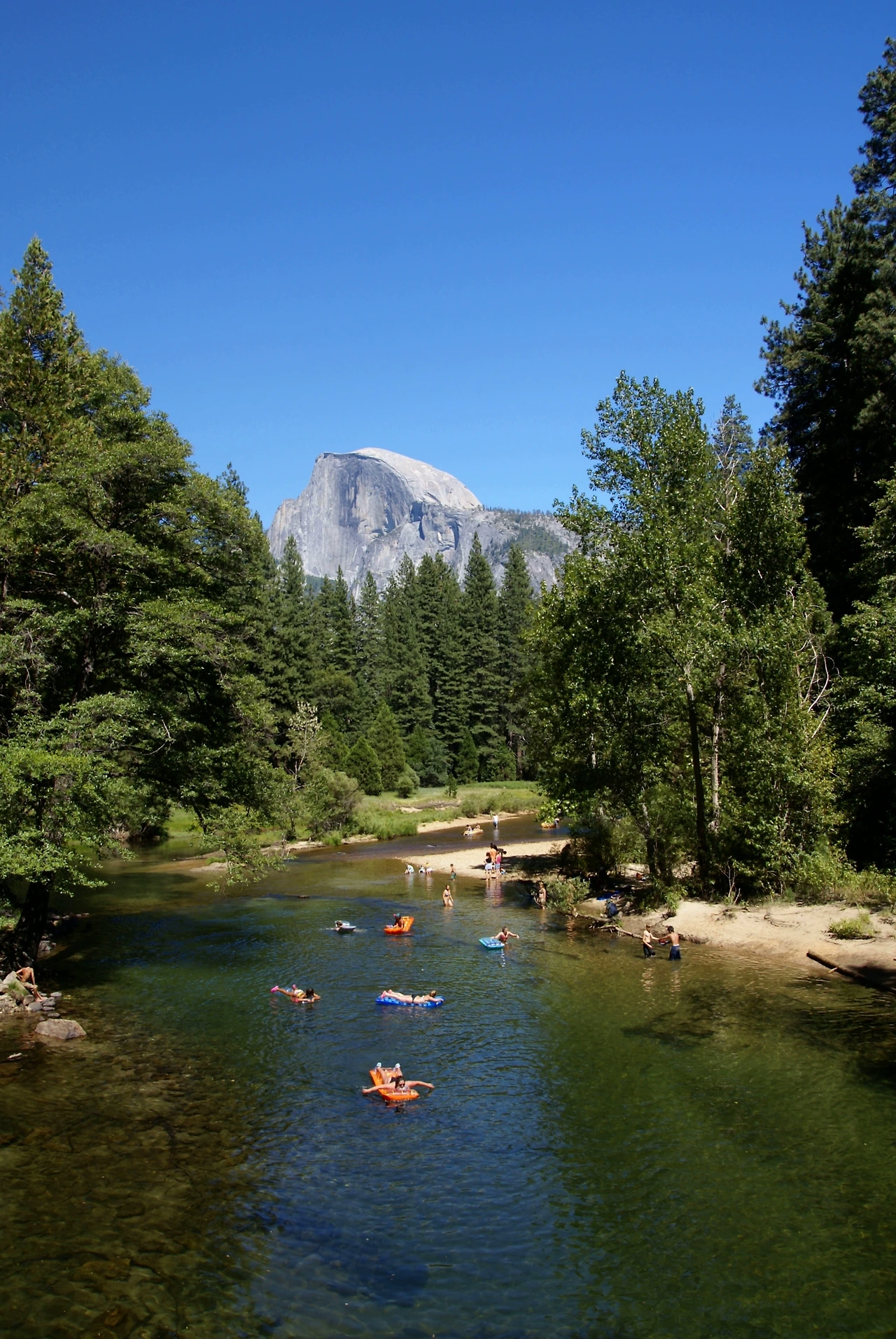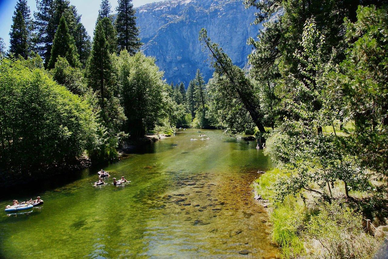 요세미티 안에 흐르는 샛물에서 어린이들이 물놀이를 하고 있었다.