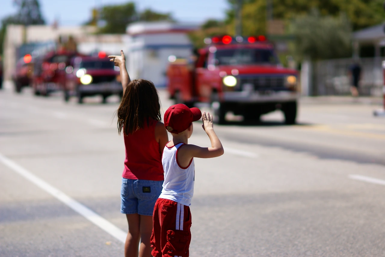 소방차에 탄 꼬마가 소방차 물을 뿌리기 시작했다.