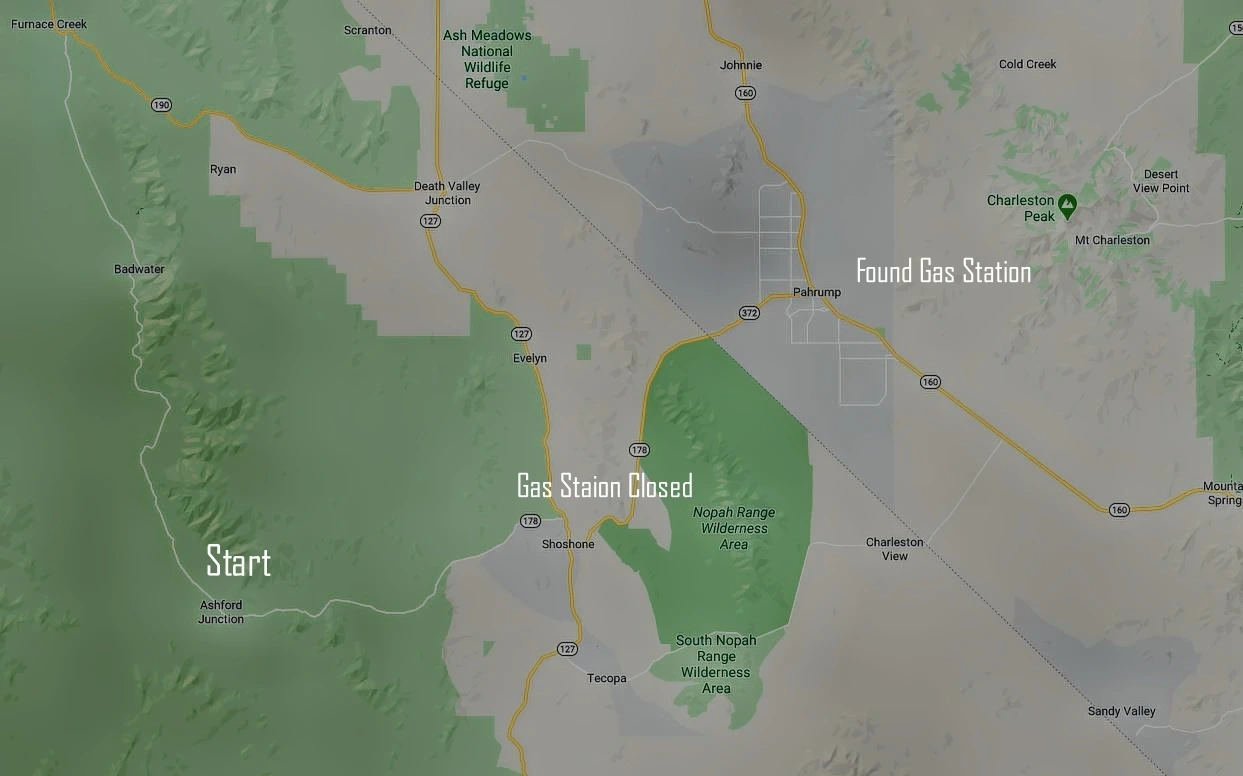 겨우겨우 해서 Shoshone에 도착해 주유소를 찾으니.. 주유소가 문을 닫았다. 정말 패닉이었다. 그리고 동네엔 아무것도 없고 지나다니는 경찰도 없었다. 렌터카 회사에 긴급구조 전화를 하려는데 이 지역에서 전화가 안 되는 것이었다. AAA도 마찬가지였다.