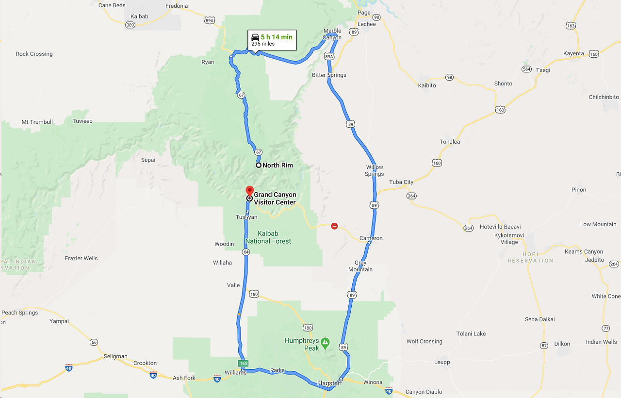 다음은 그랜드 캐니언 둘레길을 돌아서 North Rim까지 가야 하는 여정이다. 특히 North Rim으로 가는 길은 여름에만 문을 열고 겨울시즌에 봉쇄된다. 거리는 295마일로 약 5시간 걸리지만, 중간중간 사진을 찍는 걸 감안하면 8시간 정도 걸린다고 봤다.
