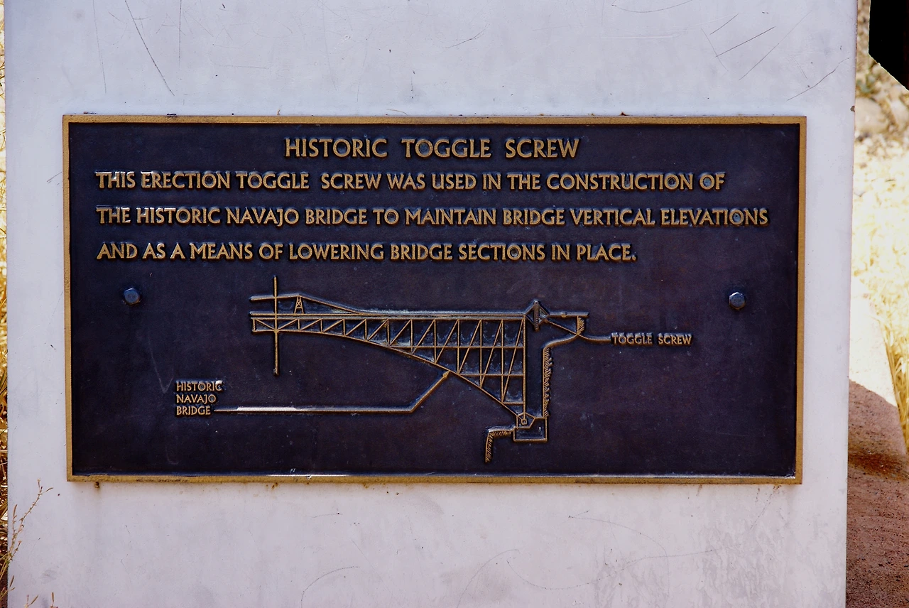 나바호 브리지를 만들 때 썼던 토클에 대한 설명을 자세히 써놨다. "이 다리에 설치된 토글 나사는 역사적인 나바호 교량 건설에 사용되어 교량의 수직 높이를 유지하고 교량 구간을 제자리로 내리는 수단으로 사용"되었다고 쓰여 있다. 아하!