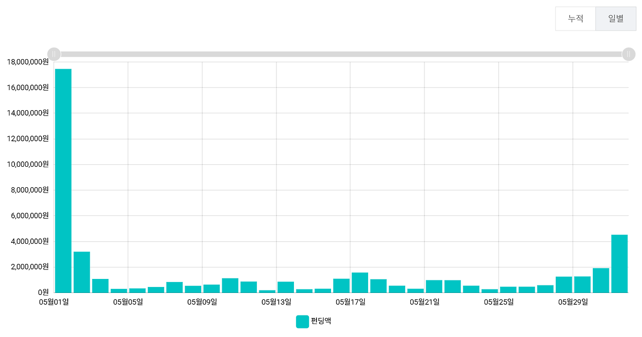 위의 차트는 제 펀딩의 일별 펀딩액 추이입니다. 차트에서 알 수 있듯, 첫날 가장 많은 펀딩액이 들어왔고 이후에는 다소 지지부진하다가, 펀딩 종료 직전 다시 한번 와디즈 랭킹에 올라 적지 않은 금액이 유입되었습니다. 본 펀딩 기간 동안 광고 여부에 따라 유입량이 크게 달라졌는데, 와디즈에서 제공하는 광고 비용이 상당히 높아 광고를 하면 남는 것이 거의 없었고, 광고를 하지 않자 유입이 적은 상황이 발생했습니다. 나중에 광고비와 수수료, 기타 지출을 정산해 보니, 오히려 와디즈가 더 많은 수익을 얻었더군요.