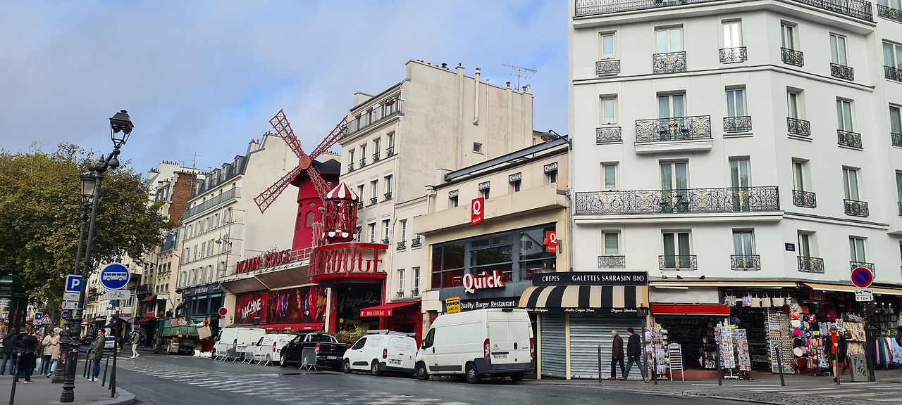 몽마르트언덕 가는 길 모퉁이에 물랑루주(빨간 풍차) 모습이 보인다.