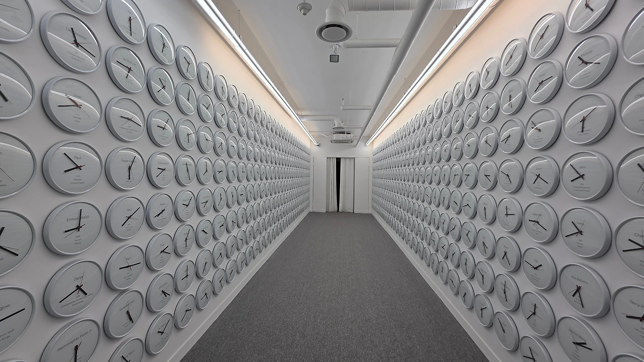 각각의 시계에는 사람의 이름과 직업, 그리고 국가가 적혀 있었고, 시곗바늘이 저마다 다른 속도로 움직이며 불규칙한 소리를 만들어내고 있었다.