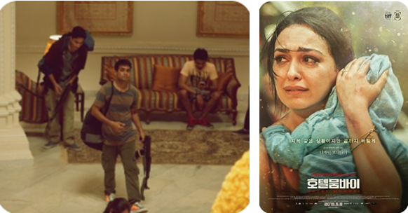 한편, 가까운 카페에 있던 여행자인 젊은 커플은 괴한 두 명이 들어와 카페 안을 난사하자 이곳을 빠져나와 도망치는 수많은 사람들 틈에 끼어 가까운 ‘타지마할’ 호텔로 피신한다. 호텔은 예약손님만 받는 곳이었지만, 많은 사람이 구름 떼처럼 밀려든 상황을 지배인을 모른 척 할 수 없었다. 그러나 괴한들은 그 틈을 타고 피신해 오는 사람들 속에 섞여 들어오게 되고 호텔에 먼저 와있던 테러범들과 합류한 테러범들은 순식간에 호텔을 장악해 버린다.