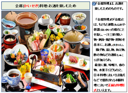 는 나오는 순서대로 상차림이 진행되며 메이지기(1868~1912)에 교토 오사카를 중심으로 전문점이 늘어났고, 이어지는 다이쇼기(1912~1926)에는 술을 중심으로 요리의