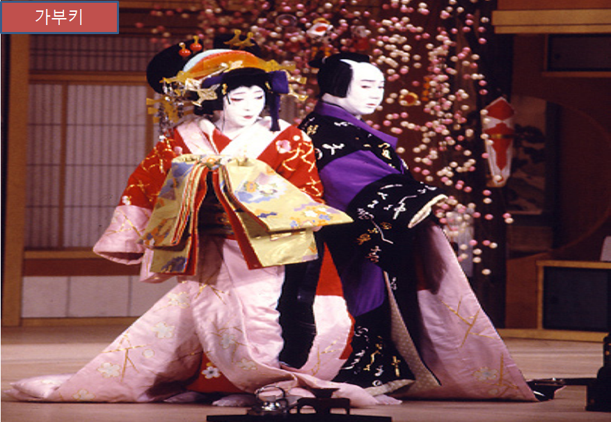 ‘큰북과 작은 북, 피리, 샤미센’ 등의 반주와 노래에 맞춰 화려한 의상을 입은 배우가 춤을 추고 연기를 하는 현대판 ‘오페라. 뮤지컬’이라 생각할 수 있겠네요.