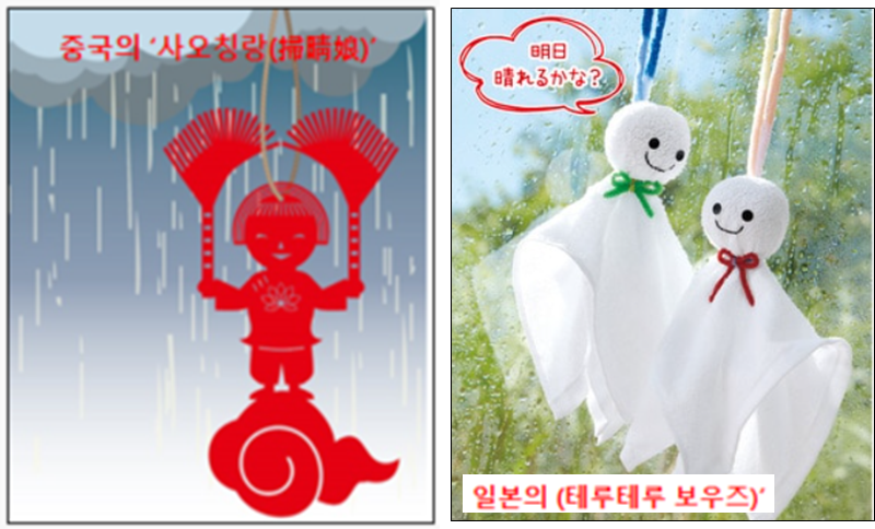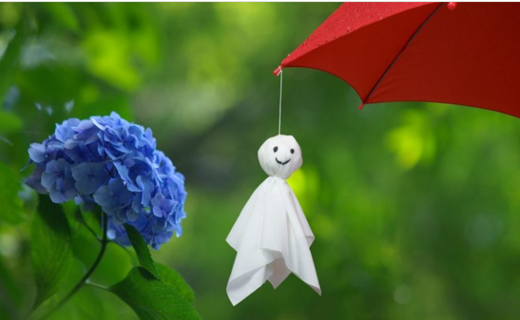 아무튼, 긴 장마에 지친 일본인들에게, 하루라도 빨리 장마에서 벗어나고 싶은 마음에서 만들어진 것이 ‘테루테루 보우즈(照る照る坊主)’인데요, 이것을 '똑바로 세운 상태에서 처마 끝 등에 매달면, 내일의 날씨가 개인다'고 하는 것이 일본의 풍습 중 하나랍니다.