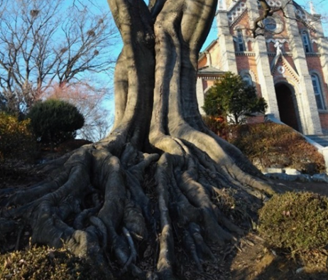 눈에 보인 커다란 아름드리 팽나무는 세월을 보여주듯 위용을 자랑했고, 제각각 앞을 다퉈 땅을 뚫고 나온듯한 뿌리의 굴곡진 선들은 성당의 분위기에 걸맞게 알 수 없는 무언의 말을 건네는 듯했다.
