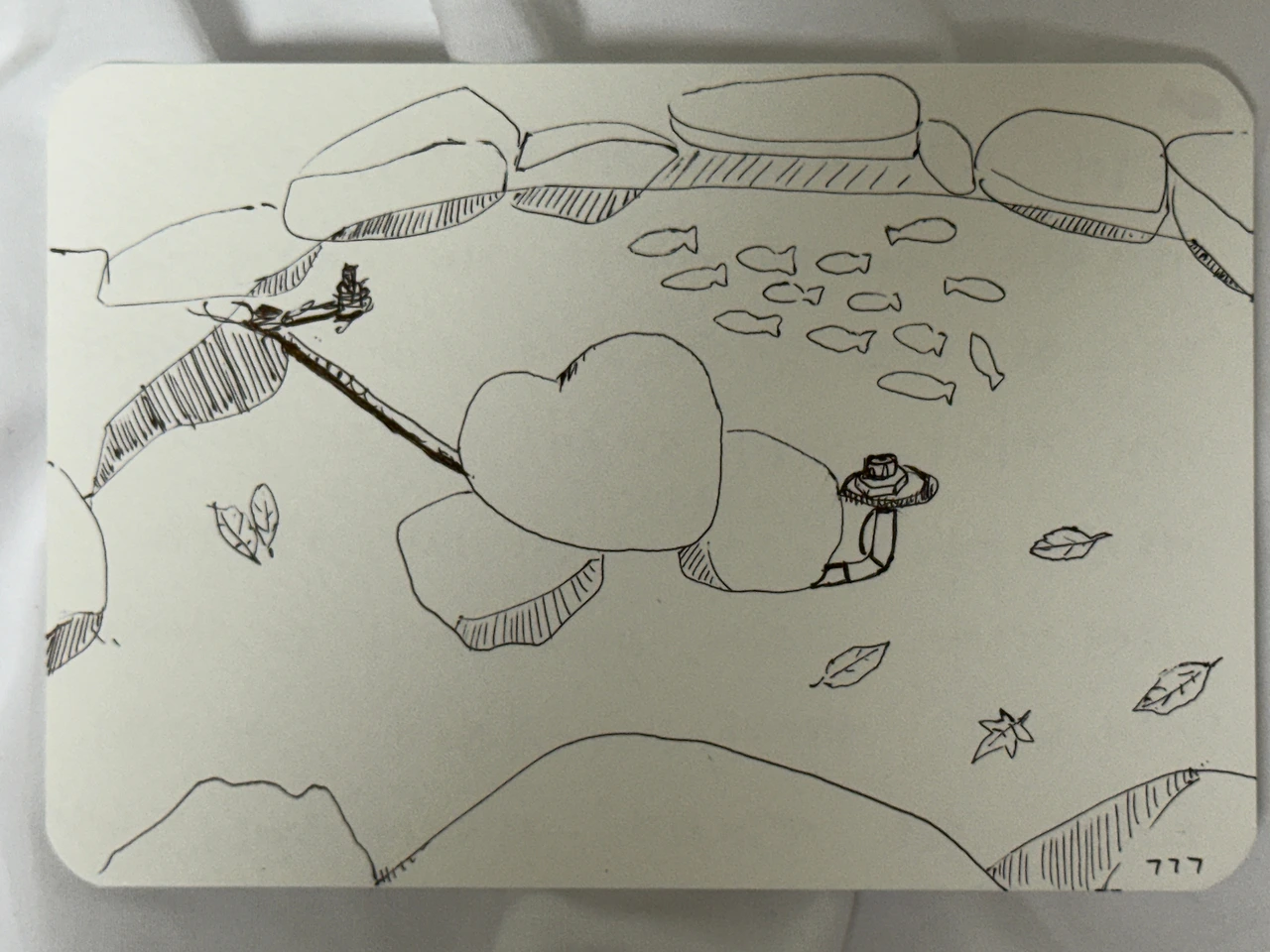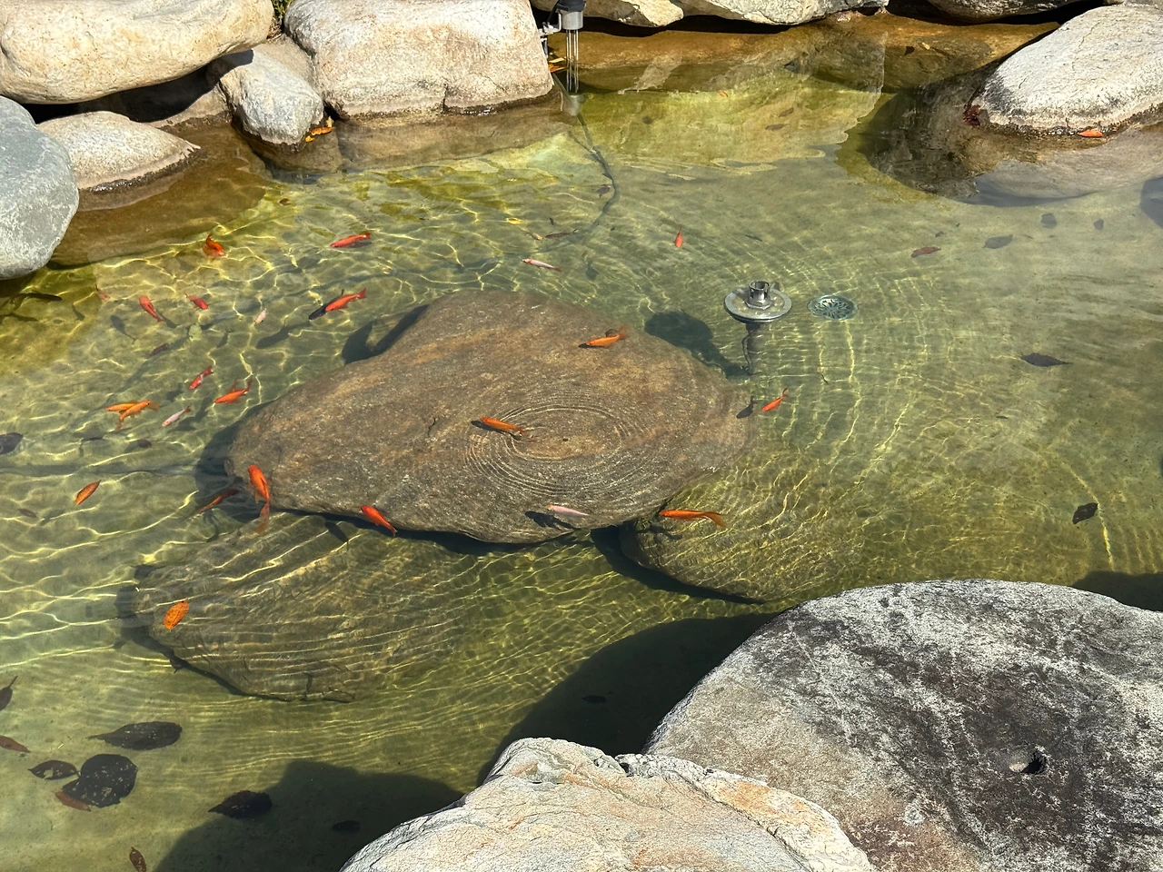 연못 안 가운데에 내게는 진심으로 읽히는 하트 모양의 큰 돌이 있다. 금붕어 무리는 그 주변을 맴돈다.