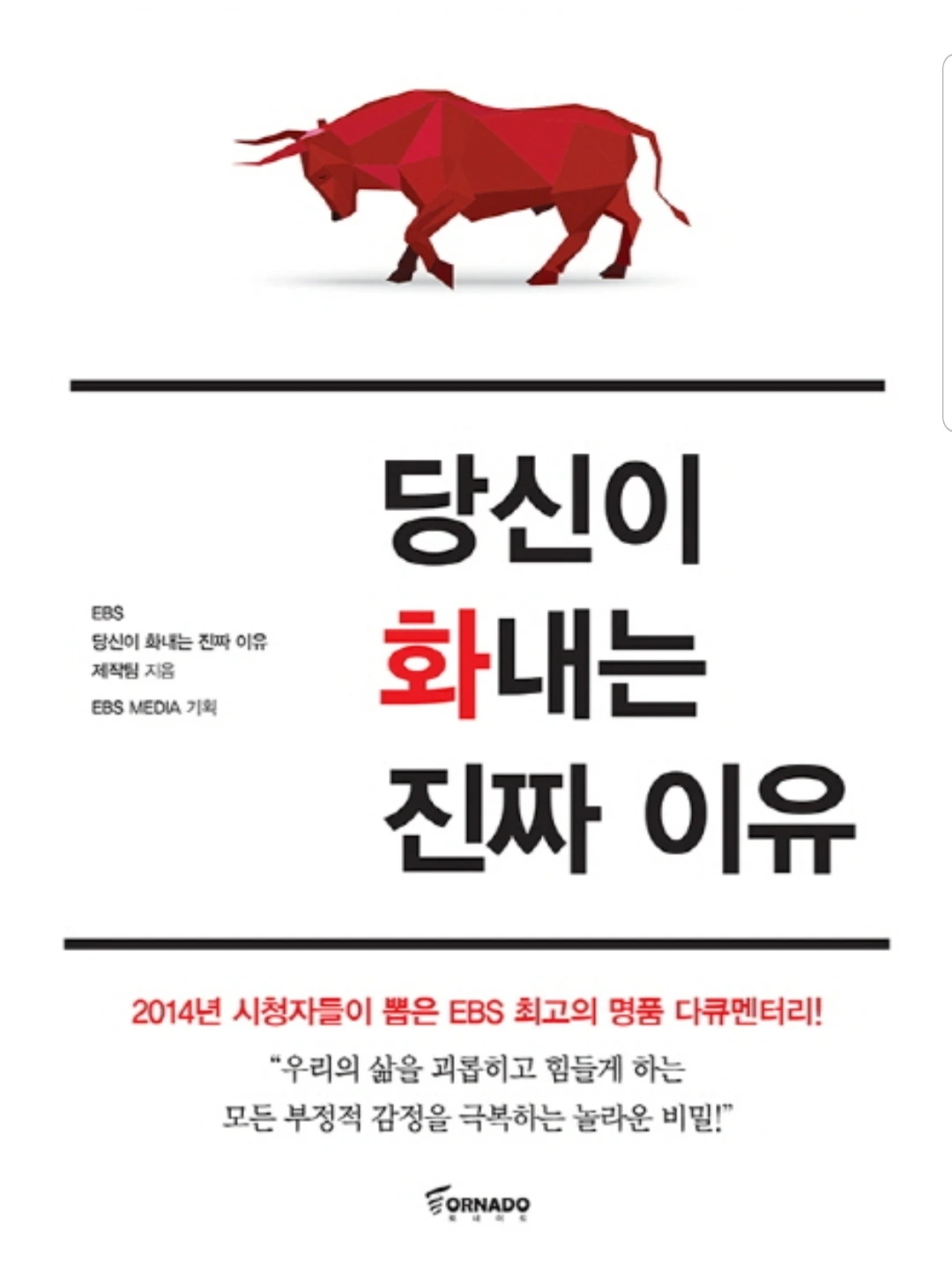2014년 방영된 내용이 책으로 세상에 태어났다. 원초적 본능인 화의 비밀, 분노의 조정자 내면 아이, 나를 바꾸기 위한 분노 디자인 그리고 마지막 장으로 화를 다스리는 기술을 소개한다. 책이 두껍지 않고 페이지 속 글자의 배열이 넉넉해 가볍게 독자들이 읽기를 바라는 맘이 느껴졌다.